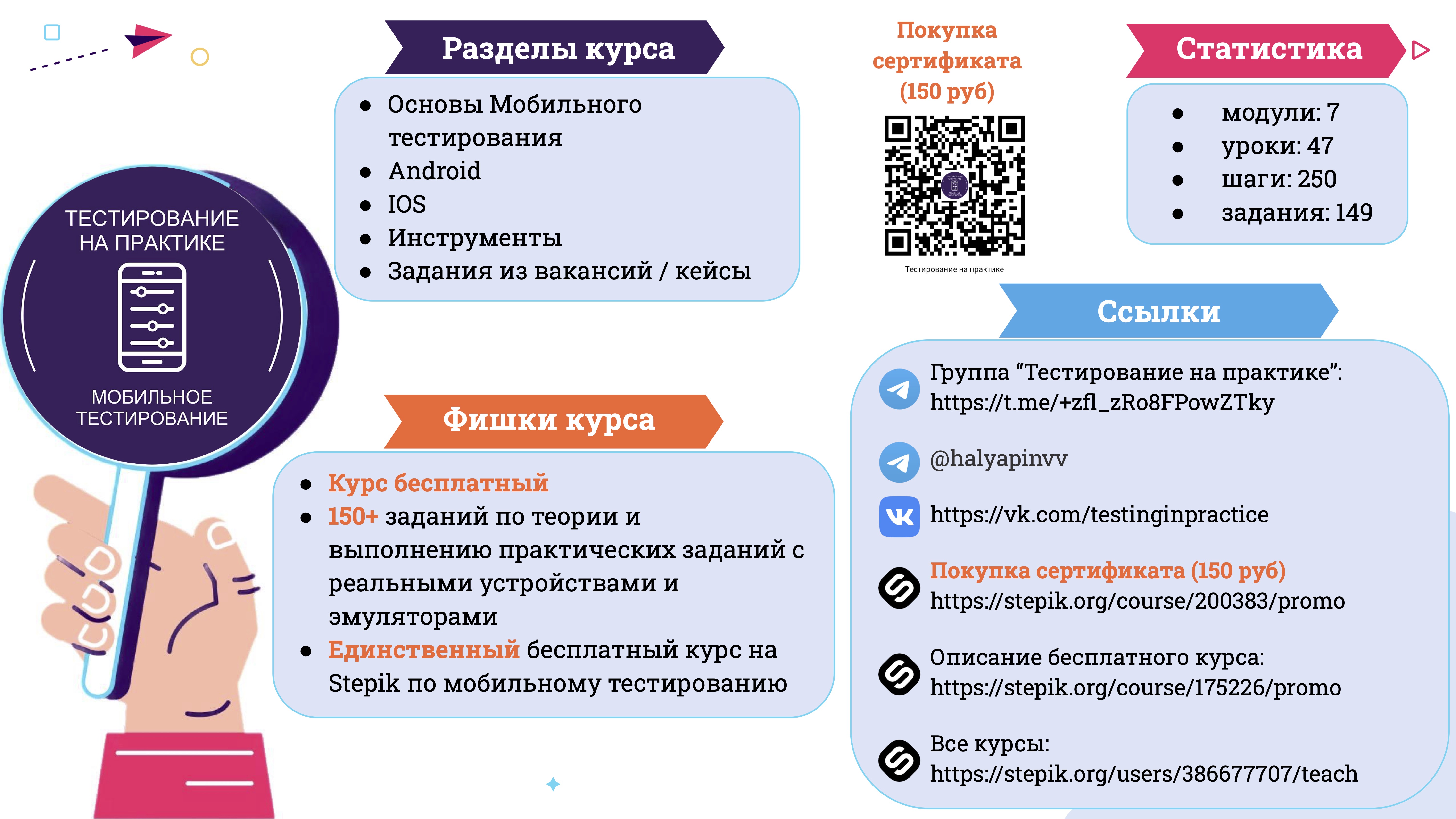 В процессе выполнения шагов курса решаются практические задачи из реальных тестовых заданий вакансий HHRU и рабочих будней тестировщиков.