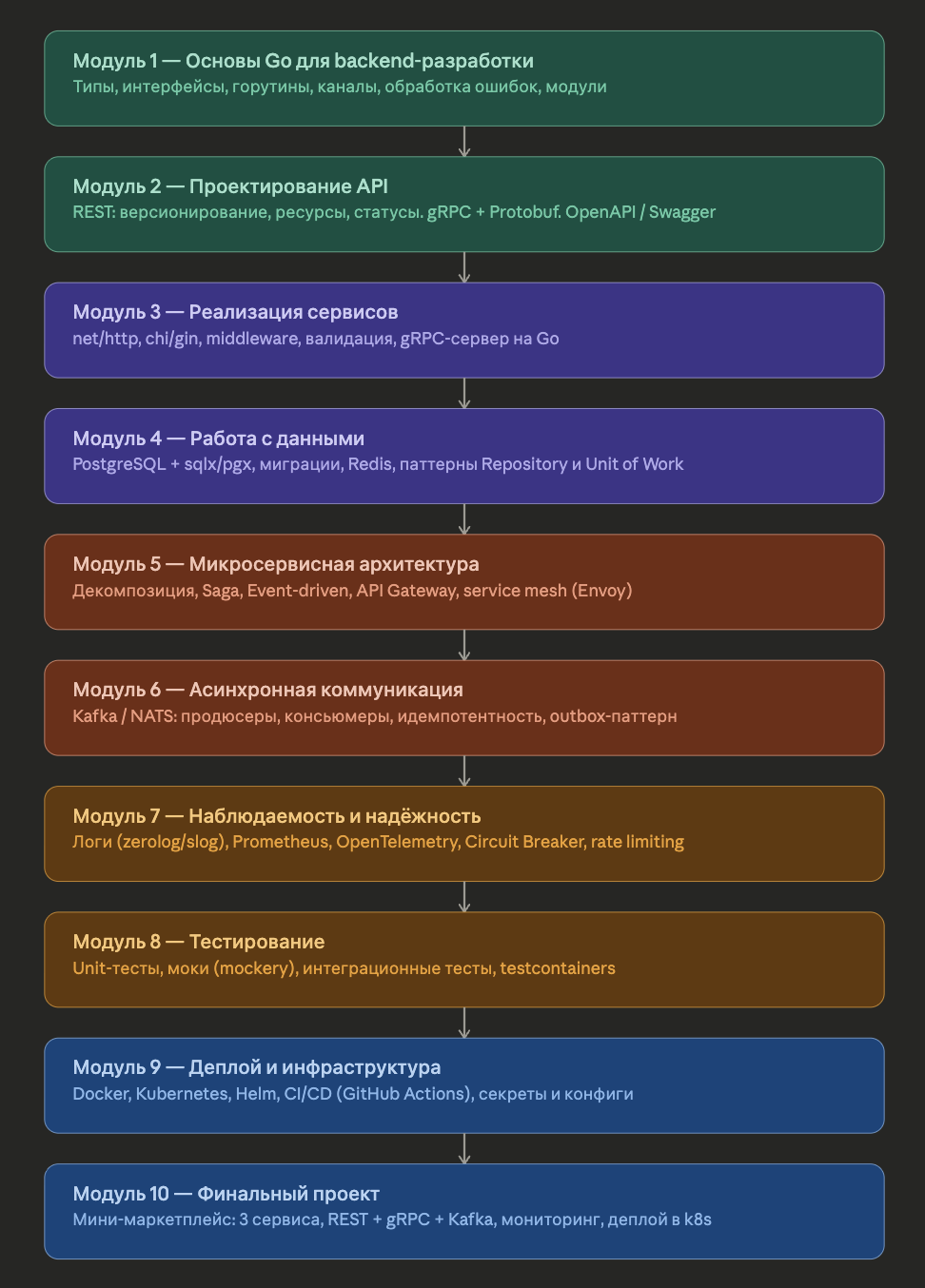Курс "Golang: микросервисная архитектура и проектирование API" поможет вам освоить разработку масштабируемых микросервисных приложений на Go. Вы изучите принципы проектирования API, научитесь применять лучшие практики микросервисной архитектуры и создавать эффективные и надежные сервисы.